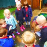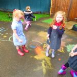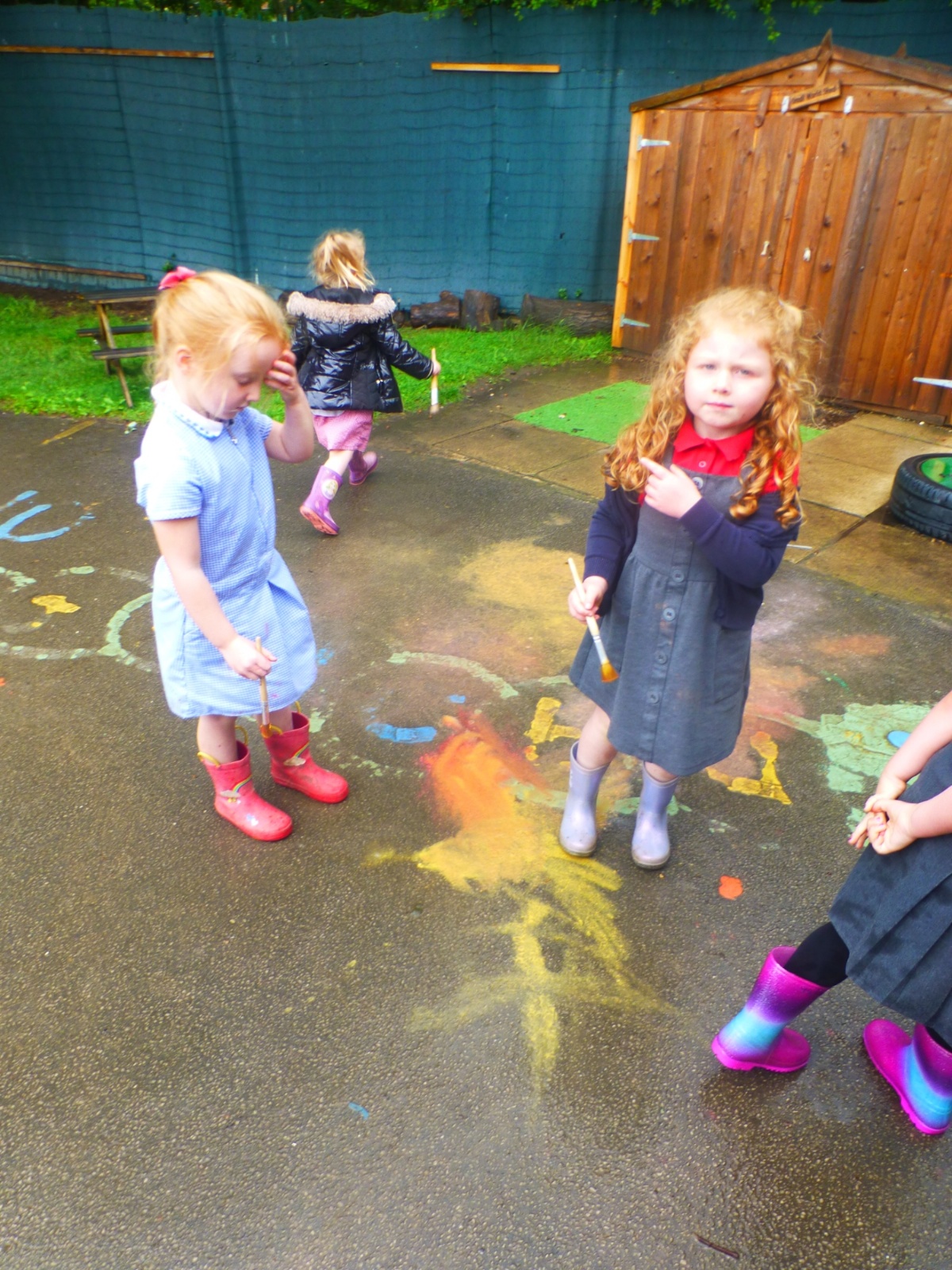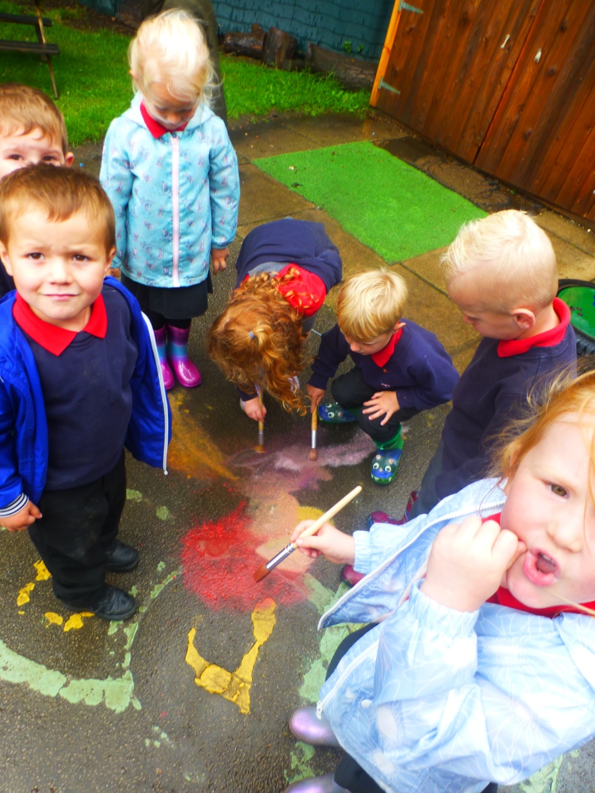 Nursery were amazed by the heavy rain we had yesterday so we experimented with colour mixing in the puddles!